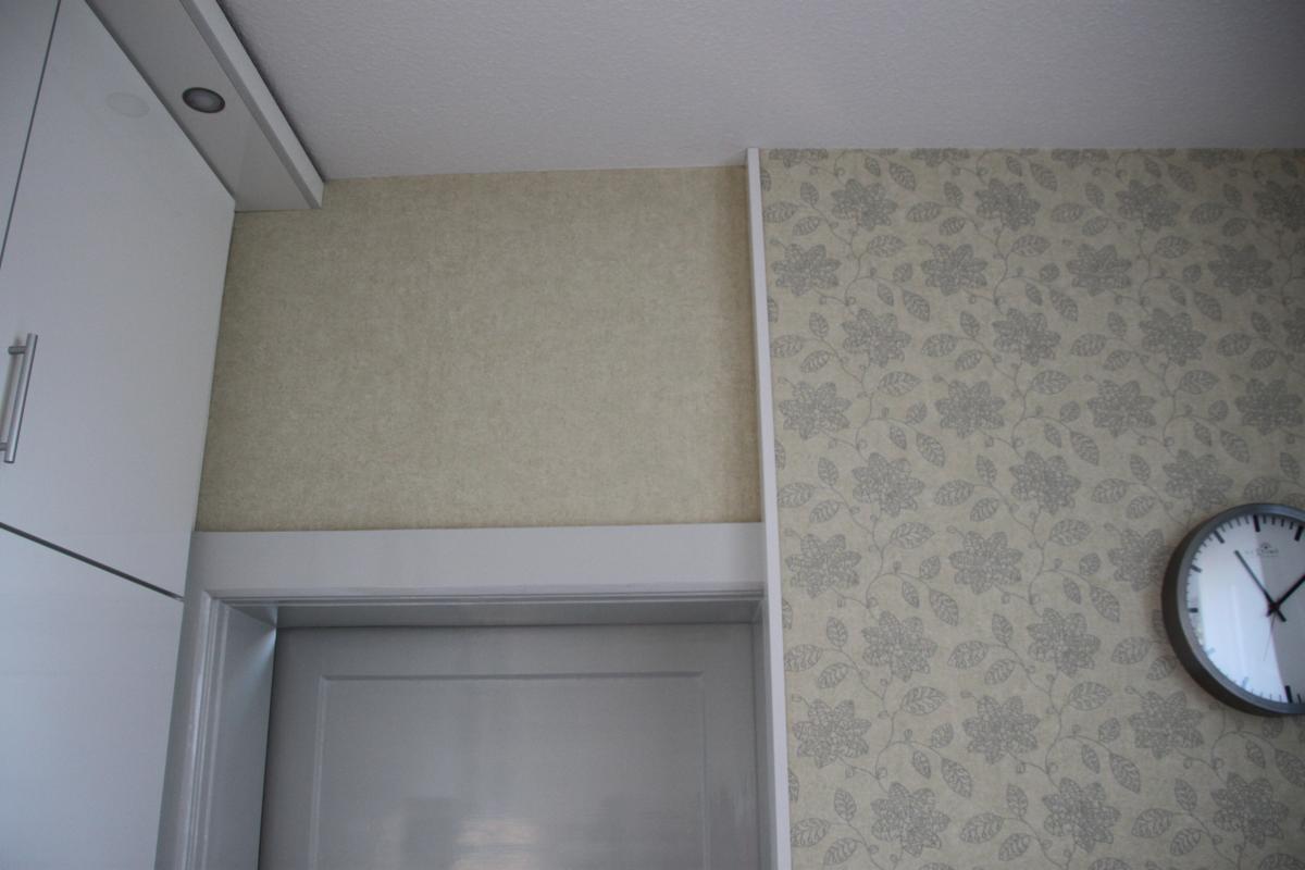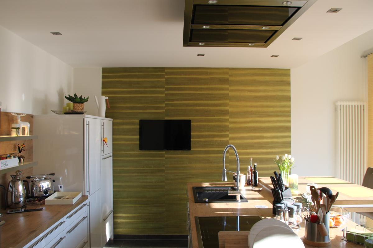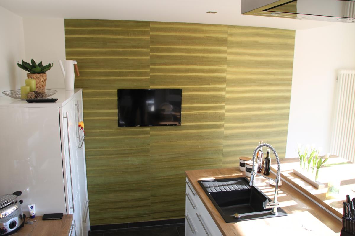 Warm, hell und freundlich sehen diese Tapeten in der Küche aus, die Blattmotive schaffen ein modernes Aussehen.